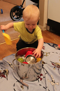 I had some colored ice left over, so I brought them out another day to entertain Zel while I exercised. I laid out a blanket in the living room and gave him some kitchen tools, a cup, bowl, baking sheet, and muffin tin.